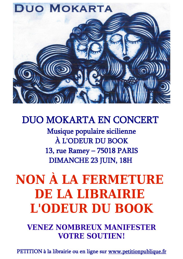 Pour commencer, tous les habitants et les élus sont invités au concert du Duo Mokarta en soutien à l’Odeur du Book. C’est peut-être la dernière occasion avant les vacances d’été de manifester votre opposition à la disparition de la librairie. L’évènement a été relayé par le magazine d’actualité littéraire en ligne Actualitté, qui suit attentivement cette affaire. Venez nombreux pour dire NON A LA FERMETURE DE L’ODEUR DU BOOK, DIMANCHE 23 JUIN à 18h. Votre présence est indispensable!