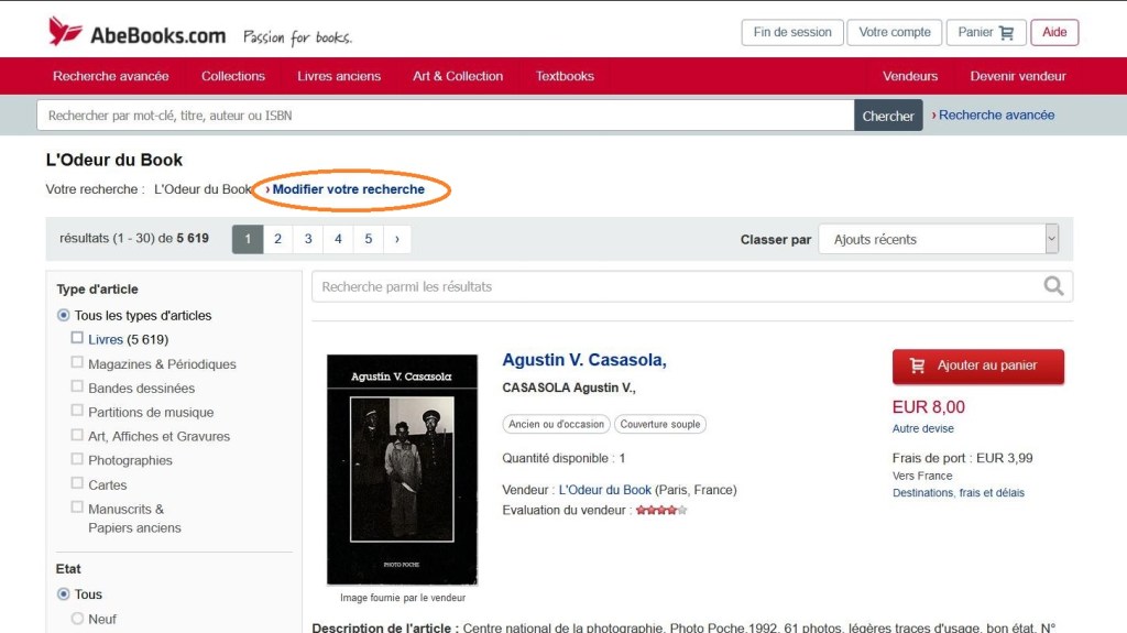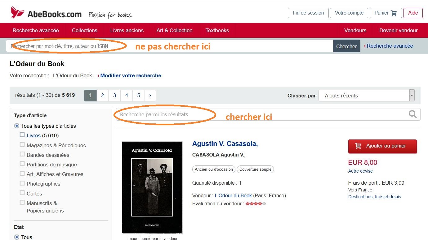 Lorsque vous effectuez une recherche, vous allez vous retrouver sur la plateforme de vente en ligne Abebooks. Pour accéder exclusivement à notre catalogue, ne vous placez pas sur la barre de recherche haute, mais plutôt sur celle qui se trouve au-dessous, qui correspond uniquement au catalogue de l’Odeur du Book.